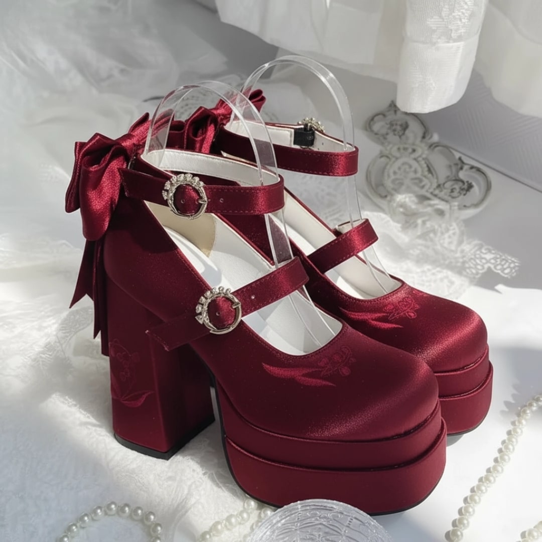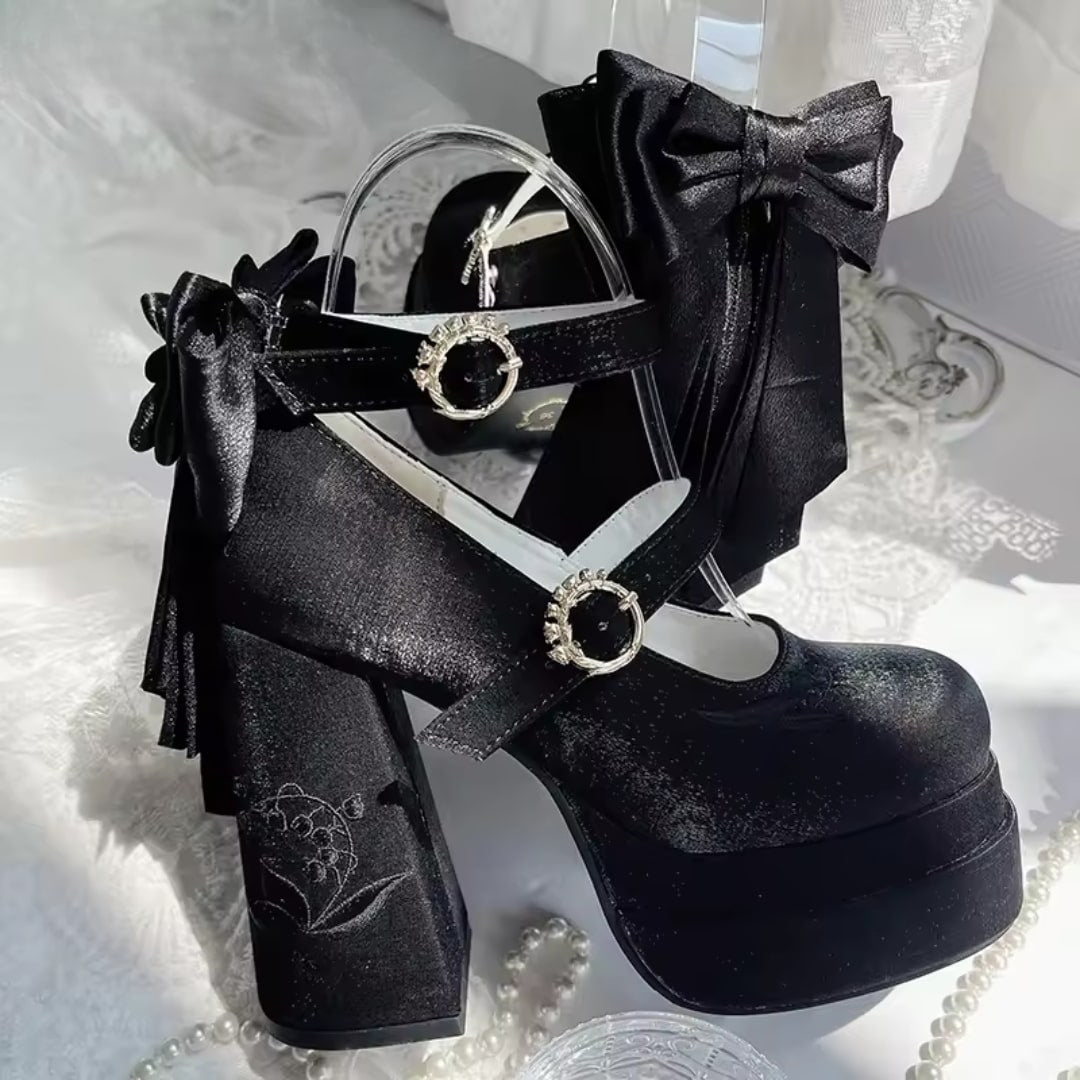 Crafted in satin and adorned with pearl-detailed buckles, the Midnight Lily Heels embody timeless gothic grace — comfort reimagined for those who rule the night.
